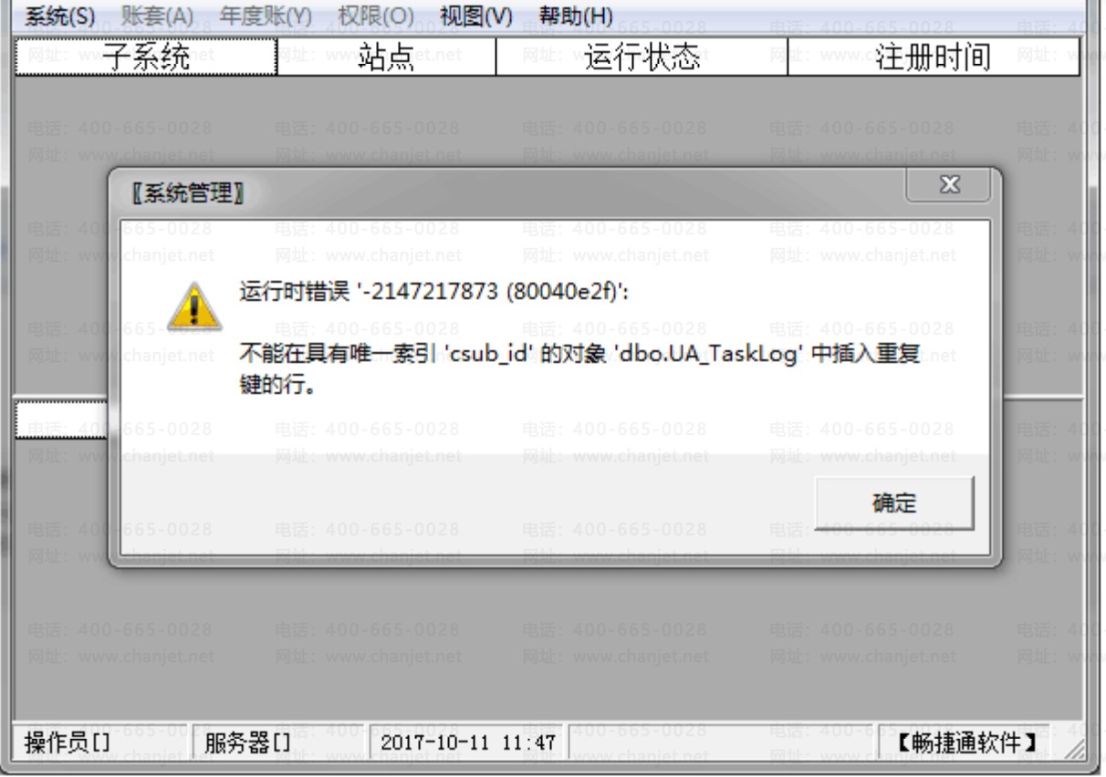 【问题现象】 打开系统管理提示:运行时错误‘-2147217873(80040e2f)’不能在具有唯一索引‘csub_id’ 的对象‘dbo.UA_Tasklog’中插入重复键行。见下图: