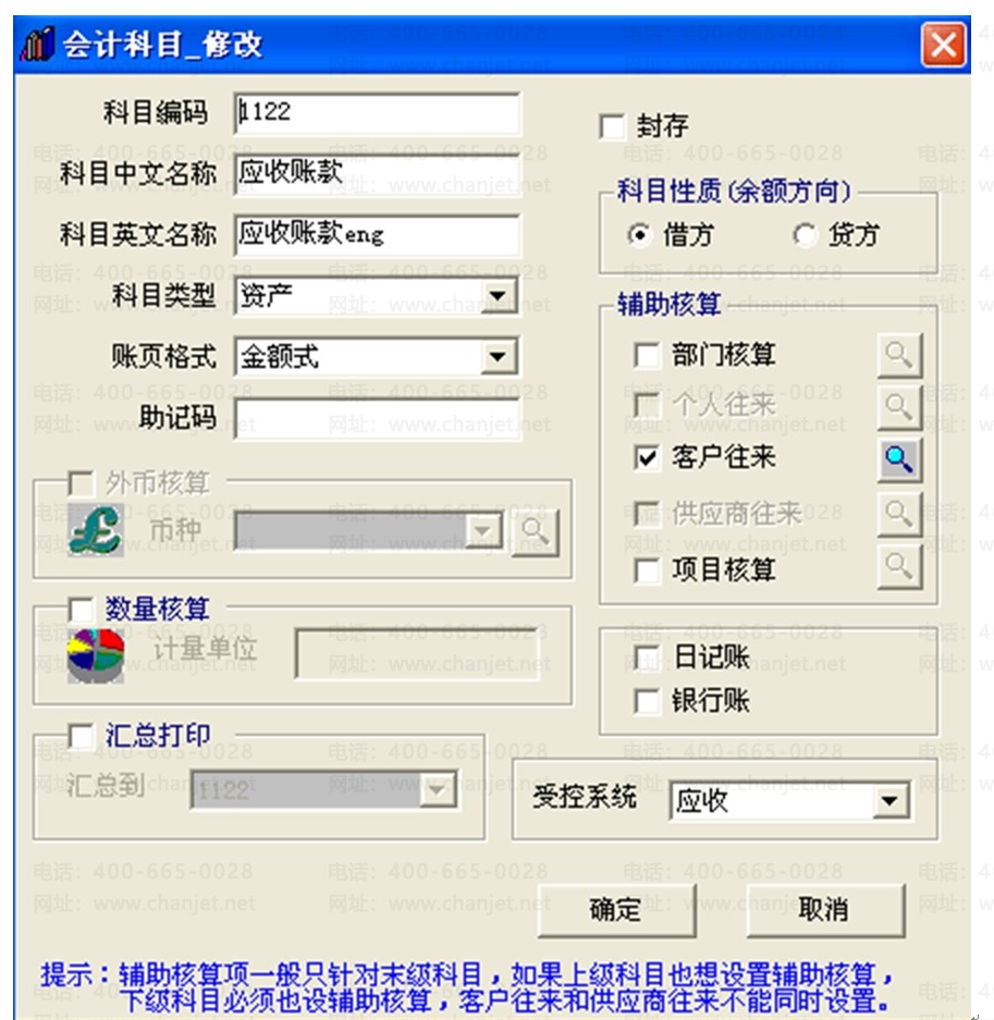 与客户的往来科目如应收账款、应收票据、预收账款可设置客户往来核算如果挂上了辅助核算的话,在填制凭证的时候,输入科目的时候,例如:要输入应收账款的科目1122,他会自动弹出一个对话框: