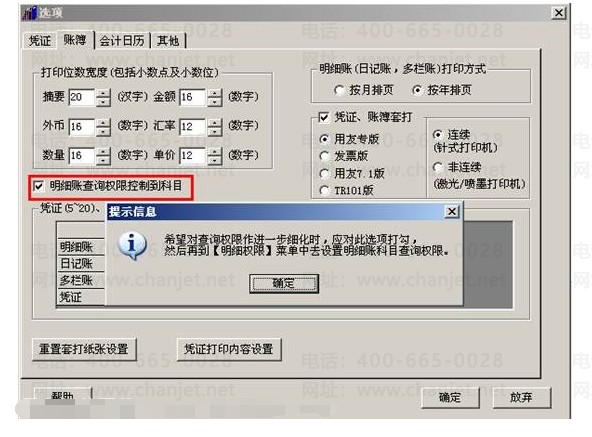(4)打开用友T3财务软件依次点击“总账”——“设置”——“选项”——“账簿”,勾选“明细账查询权限控制到科目”: