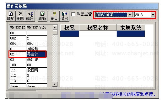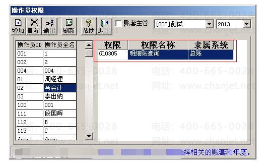 (2)先选中账套,再选中操作员,点击“增加”按钮(以操作员02,账套006测试为例):