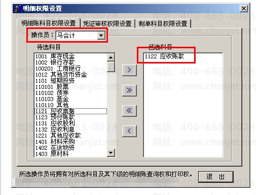(5)依次点击“总账”——“设置”——“明细账权限”菜单,为该操作员选择查询科目: