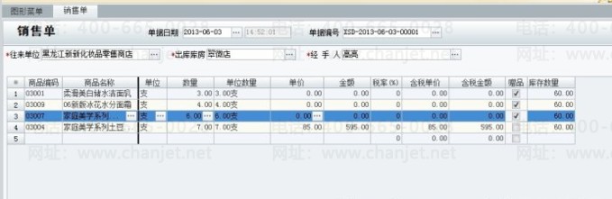 一般情况下,在相应商品处打上赠品的属性以后,单价和金额自动变成为0,如下图