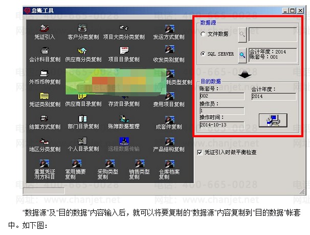 8、“数据源”及“目的数据”内容输入后,就可以将要复制的“数据源”内容复制到“目的数据”帐套中。