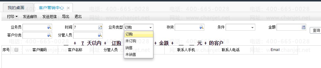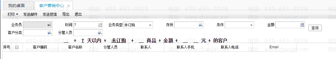客户营销中心是企业对老客户资源里的营销,针对各种销售情况进行分析,在客户的海量数据中确定有哪些客户属于分析范畴,以便对分析范畴内的客户制定有针对性的营销策略和方案。
