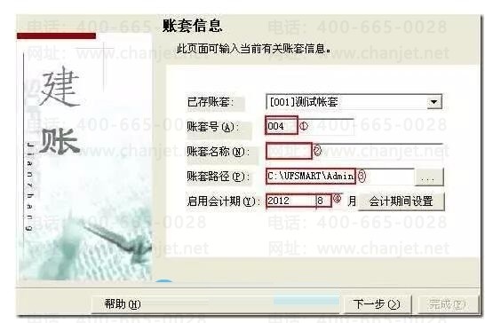 三、输入帐套号,名称,路径和会计期间后点击下一步,注意:账套号和已存账套的账套号不能能重复,默认出来的号码是系统排列的不用更改就可以,不会重复。
