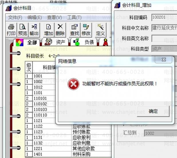 问题现象:用友增加会计科目时提示:功能暂时不能执行。由于账务的需要,我们经常需要中途增加明细科目,但是增加的时候却提示功能暂时不能执行,请确认是否具有增加科目的权限或已关闭所有业务模块!