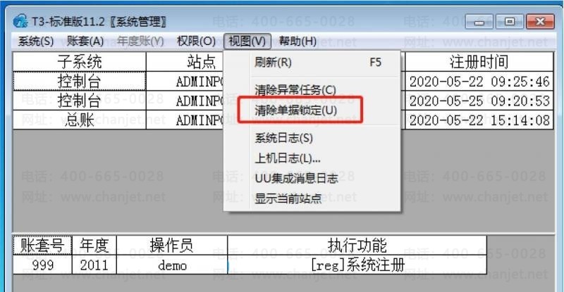 (2)点击菜单栏上的“视图”,选择“清楚异常单据锁定”,再点击“视图”菜单下的清除异常任务,清除后隔再重新登录软件;