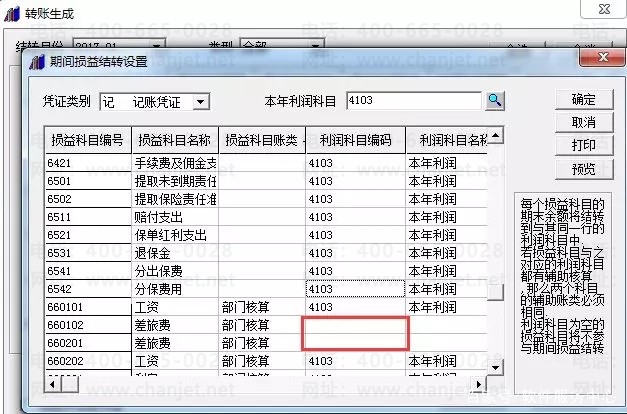 查看期间损益结转设置,检查利润科目编码是否全选。若有空白,说明该损益科目可能仍有余额,没有结转。