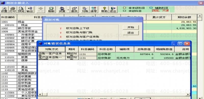 3.如果在期初余额或者期末对账中发现错误,点击“显示错误信息”或“错误”按钮检查具体错误科目信息: