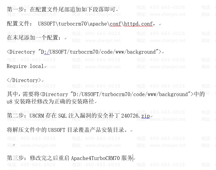 U8从v16.5开始,CRM不再作为主安装盘的一部分,而是作为独立安装盘发布。在主安装盘选择全部模块不会安装CRM模块。如果没有从单独的安装盘安装U8CRM,不会受到本漏洞影响,无需进行任何处理。