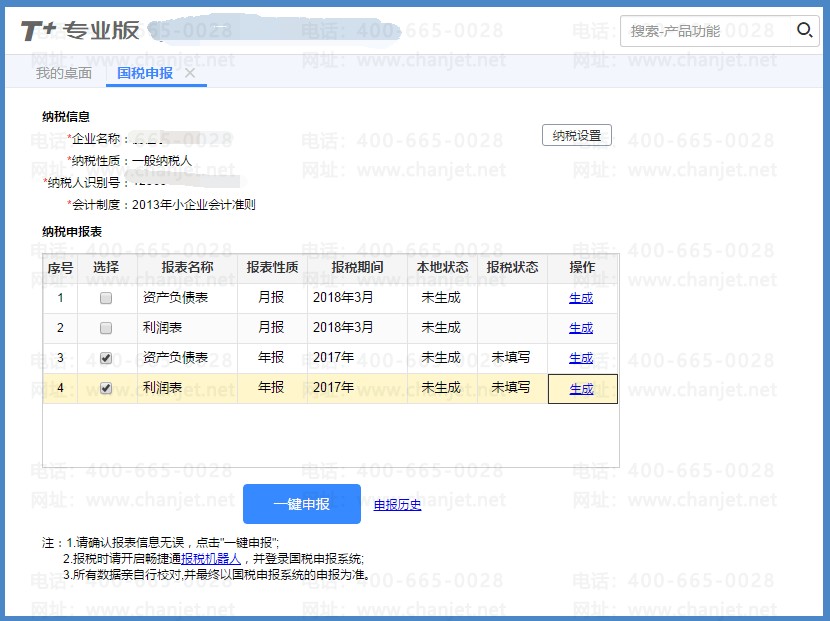 申报方法一、在【一键报税】界面,点击【生成】按钮,生成纳税申报表。此处申报表内容由系统根据企业的纳税性质、会计制度,申报时间来自动出具待申报列表。