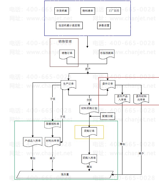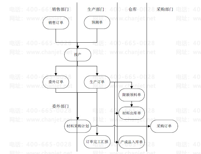 由销售部门填写销售订单或者由生产部门根据销售预测填写预测单,并按照销售订单或预测单依据物料清单推式(投产)生成生产订单或委外订单;