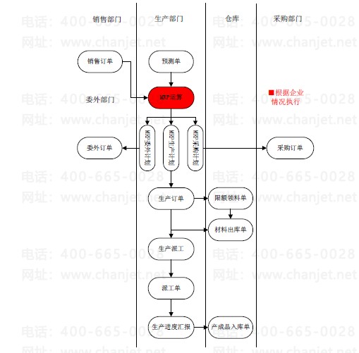下达MRP生产计划生成确认的生产订单,下达MRP委外计划给委外部门生成委外订单,同时将MRP采购计划传递给采购部门作为生成采购请购单和采购订单的依据;