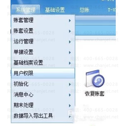 打开系统管理——用户权限,双击出现一个设置权限的界面。可以看到这里有几个默认的组别,其中账套主管组里面所有的权限都有,其他的两个组可以随意的权限自己设置。