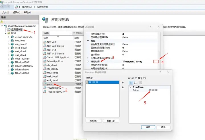 打开iis服务管理器,可以直接在window搜索iis或者在控制面板->管理工具中找到,打开后,如下图所示:所对应的应用程序池(应用程序池的名称tplus)中选择高级设置,在回收中的特定时间,修改这个设置为客户休息的时间即可,如果客户下午休息,就修改为15:00:00等时间。