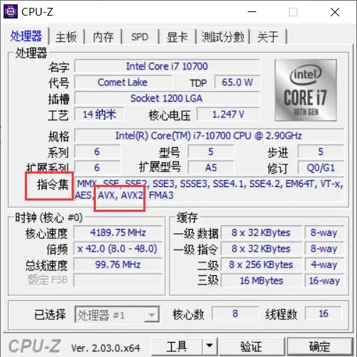 3.打开CPU-Z软件,在指令集中查看是否包含AVX指令集,如果没有该指令集,则不支持。