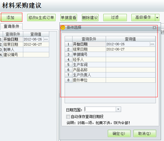 在进入材料采购建议的界面,点击添加弹出条件选择的界面。