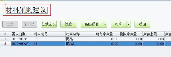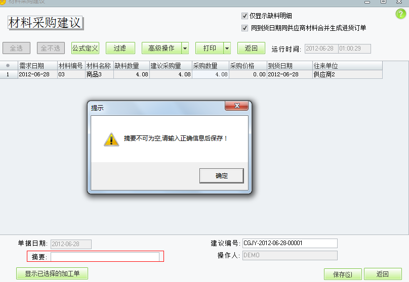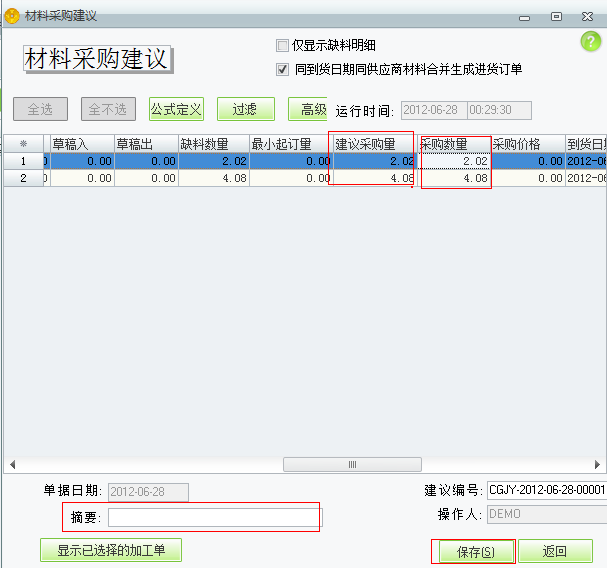 设置好了相应的公式会生成相应的材料采购建议,要点击保存来保存这张材料采购建议。建议采购量是根据设置好的材料采购建议公式生成的,采购数量默认=建议采购量,也可以手工修改。