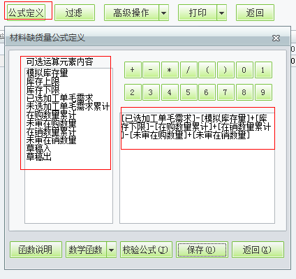 在材料采购建议设置公式的界面,点击公式定义可以设置好材料采购建议的公式。设置的公式如:缺料数量=[已选加工单毛需求]-[模拟库存量]+[库存下限]-[在购数量累计]+[在销数量累计]-[未审在购数量]+[未审在销数量]。