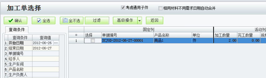 在上图中弹出的条件选择界面点击确定,进入加工单选择的界面,在这里可以选择生产或委外加工单。