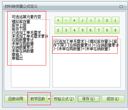 材料缺货公式支持加减乘除四则混合运算和数学函数
