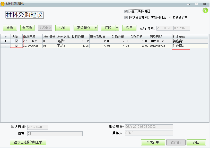 点击保存后的材料采购建议可以选择相应的商品并录入好采购价格和往来单位点击生成订单即可生成一张未审核的进货订单。