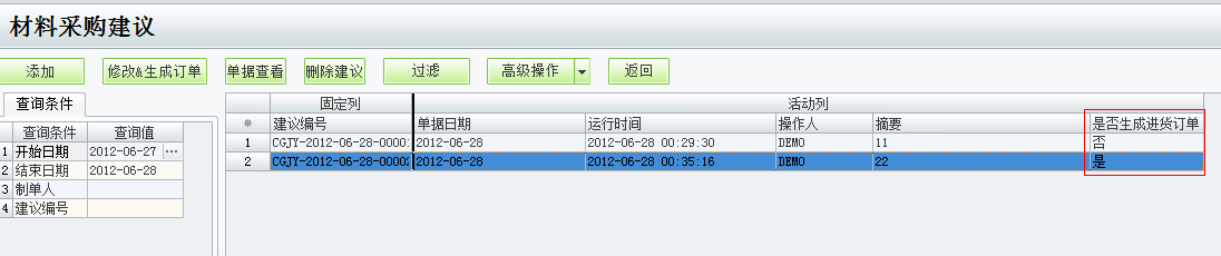 是否生成进货订单的材料采购建议在辅助中心--材料采购建议里查询到