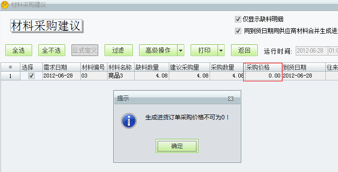 二、如下图点击生成订单提示“生成进货订单采购价格不可为0!”,是由于商品的采购价格为0,把商品的采购价格填写正确,再点击生成订单即可。