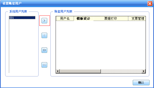 4.在设置账套用户中,选中新增的操作员,点击“〉”,将操作员所在的系统用户列表移动到账套用户列表中。