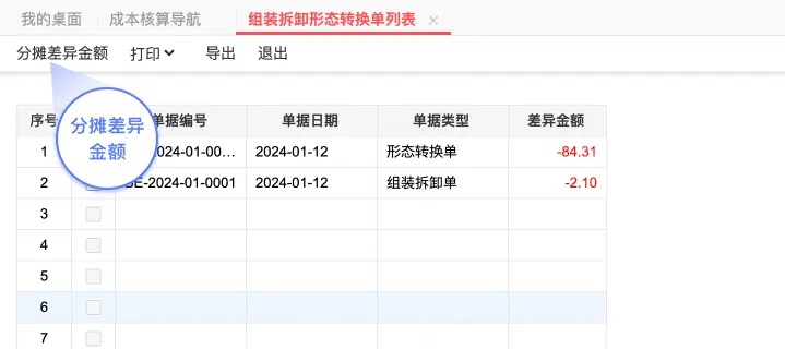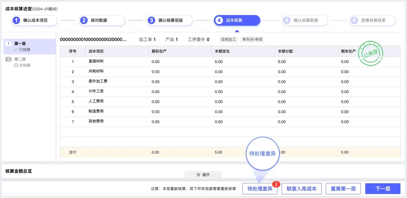 1. 每一个层级核算完之后,会在界面中展示当前层级的成本对象涉及到的形态转换单和组装拆卸单的有差异的明细行,并列举到待处理差异的列表中。
