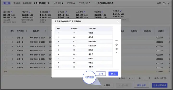 在导航第四步进行层级的成本核算时增加一个调整仓库计算顺序的交互,点击按钮后可以调整对于全月平均的存货,进行成本核算后,重新计价的仓库计算顺序。