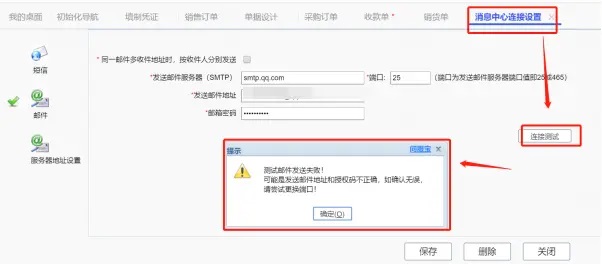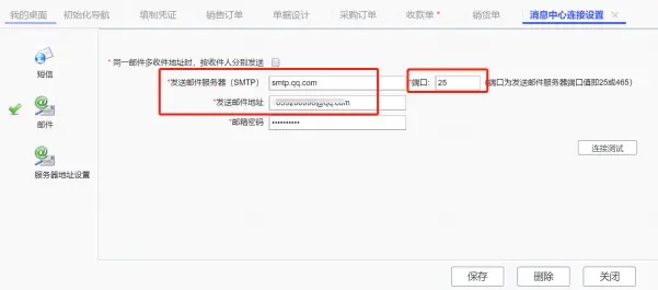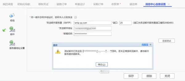 1.系统管理-消息中心连接设置-邮件;填写发送邮件服务器,及邮箱号。服务器一般为smtp.+邮箱后缀
