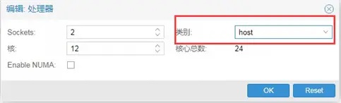 2.将CPU类别选择为HOST,重启服务器
