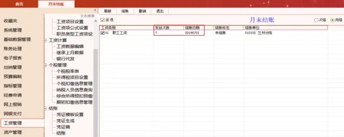 1. 查看上月工资是否已经结账,点击工资管理—结账—结账,如下图所示,显示结账日期为20190701说明六月已经正常结账,可以开始做七月份工资,如果显示结账日期为20190601,则表示上月工资未结账,点击结账按钮,六月工资结账之后再开始做七月工资。