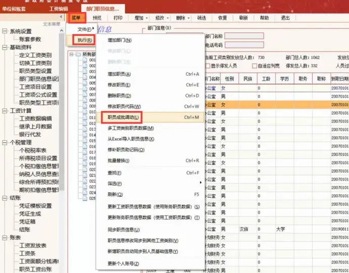 l 人员调动:在基础资料—部门职员信息设置界面,菜单—菜单—执行—职员成批调动