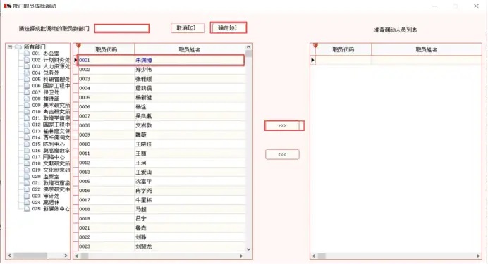 如下图所示,选中需要调动的人员,点击向右箭头,该调动人员进入准备调动人员列表,然后在上方选择需要调入的部门,点击确定即可。