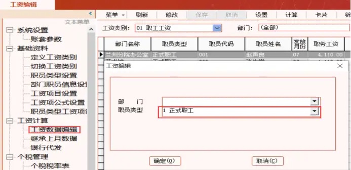 3.清空本月继承的上月数据:点击工资计算—工资数据编辑,选择相应的职员类型,该操作手册以正式职工为例,点击确定进入。