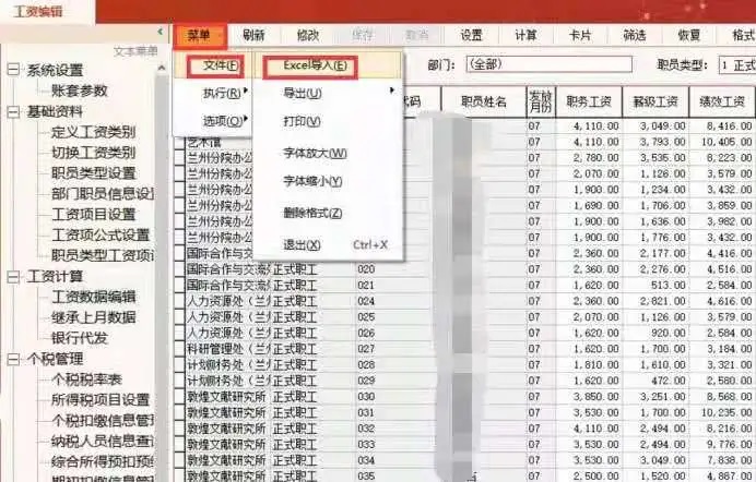 1. 在工资数据编辑界面,开始做七月份工资,在菜单—文件—EXCEL导入,也可以手工做进去(点击修改),将整理好的模板(必须将导入模板中的身份证和个人账号清空)