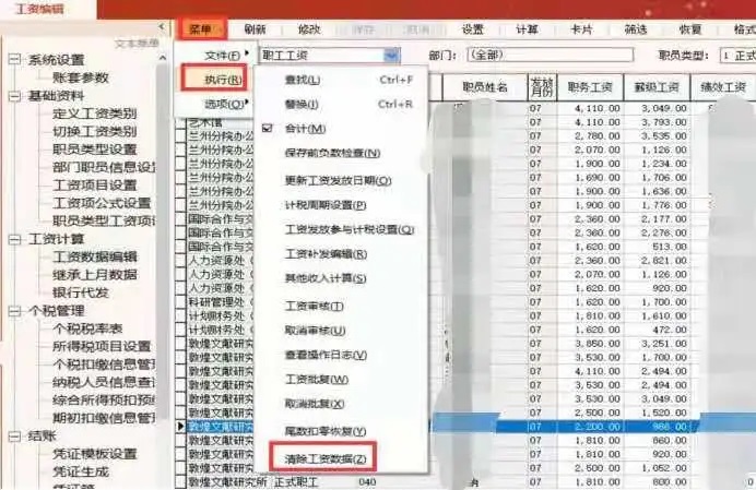 点击菜单—执行—清除工资数据,点击菜单栏的保存,然后点击计算(继承上月身份证信息和个人账户信息)