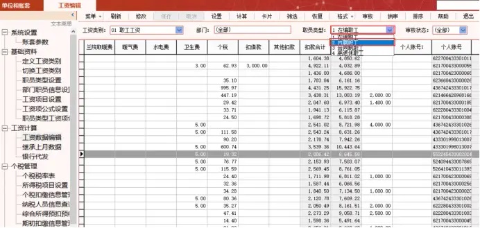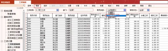 在工资数据编辑界面,点击职员类型选择下一个需要导入的职员类型,点击刷新,切换职员类型,依照上一步导入,计算,审核其他职员类型数据。