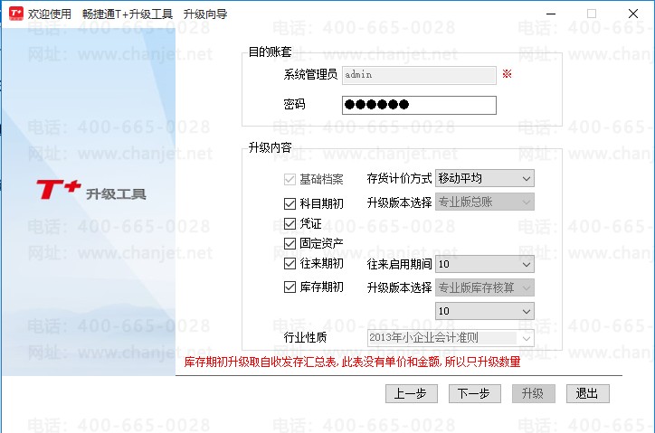 升级内容:根据账套情况选择需要升级的内容,主要包括基础档案、科目期初、凭证、固定资产、往来期初和库存期初。