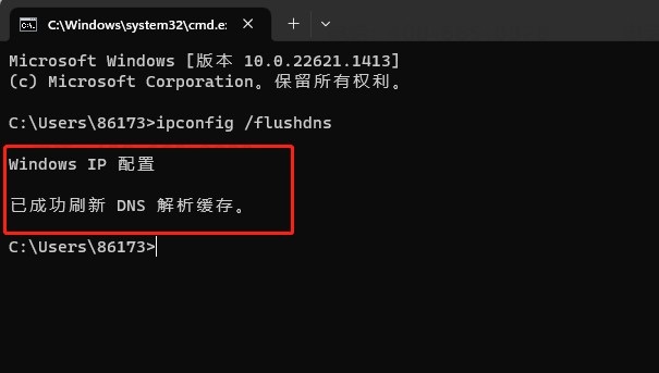 4.此时会提示已成功刷新 DNS 解析缓存
