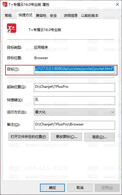 2、目标中输入:T+浏览器所在路径地址 -nomerge"登录地址",例如:D:\Chanjet\TPlusPro\Browser\tplusbrowser.exe -nomerge"
