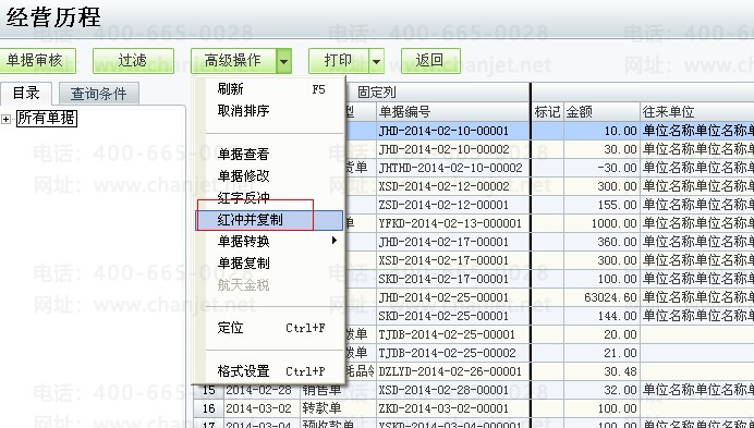 2、在经营历程里把所有业务单据红冲并复制成草稿;如图所示: