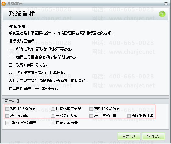 3、再去维护中心下面做系统重建,注意红框中选项都不要选,这样可以保留草稿、订单和期初值,当系统初始化完成后,将期初修改正确后,在信息中心业务草稿中将单据重新过账即可,这样就不需要重新录入单据了。