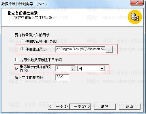 (6)选择专门的一个硬盘进行备份数据,创建文件夹后,在图中选择此路径,并且选择到使用此目录,选择路径,另外需要勾选上删除几周后的数据,保留多长时间的数据,或者也可以选择成几天的数据,以免数据太多导致硬盘不够使用。下图界面设置完成后,点击下一步,弹出的界面不做设置,然后一直点击下一步,到完成为止。