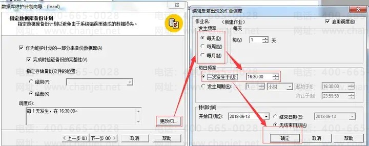 (5)点击上图中的更改,选择备份数据的周期,是每周备份一次还是每天备份一次,还是每月备份一次,根据实际情况决定,然后点击确定呢后再点击下一步进行设置。