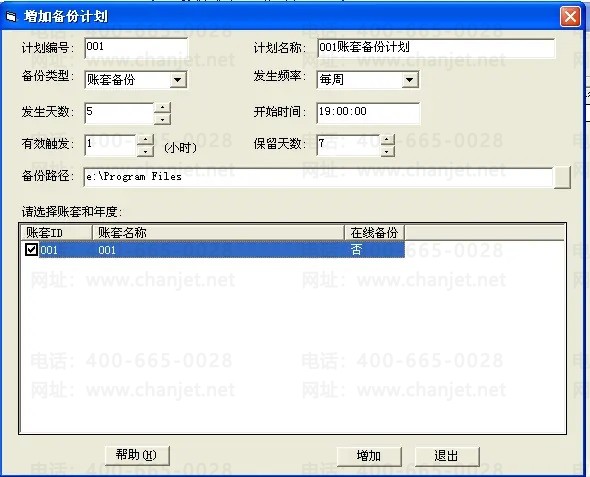 5.举例,对001账套每周5下午7点进行备份,备份文件保留天数为7天