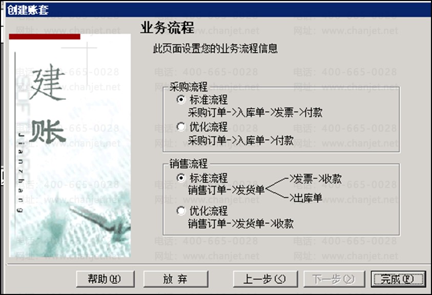 这个是设置进销存的业务流程,是否需要以发票立往来账,还是以单据立往来账的。单独的财务模块,可以不用管它,直接点完成