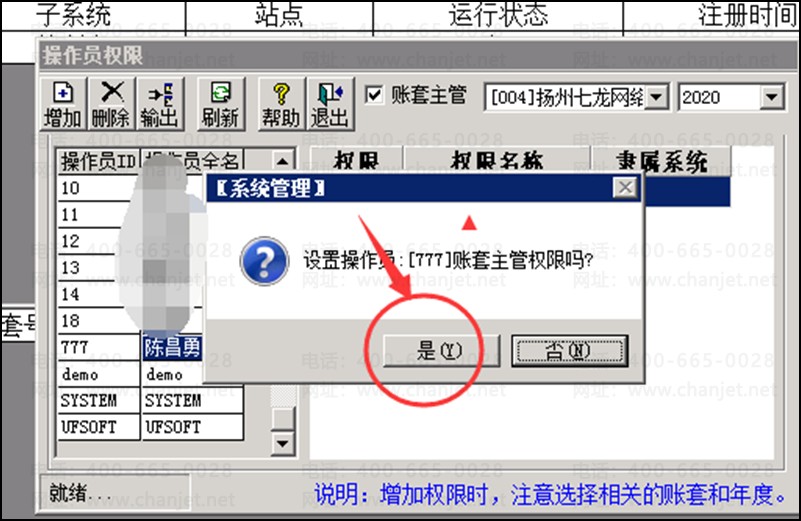 设置的步骤是右边先选择需要设置权限的账套和年度,然后左边再选中操作员,然后勾选账套主管前面的勾选项,就成功了